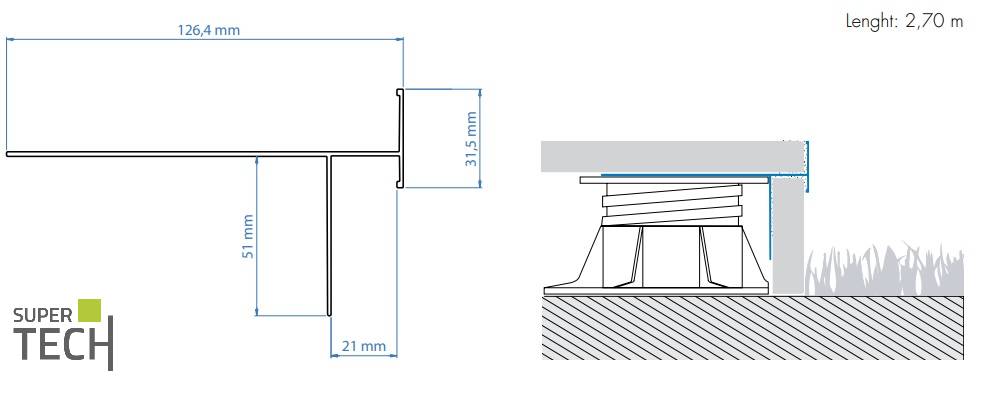 Profil realizat din aluminiu pentru mascarea marginilor de terasa si balcoane acoperite cu placi ceramice groase, care sunt aplicate pe ploturi cu diferite inaltimi. Cu acest profil puteti realiza rapid si usor o mascare eleganta a marginilor placilor de gresie, in special a celor cu grosimea de 2cm.
